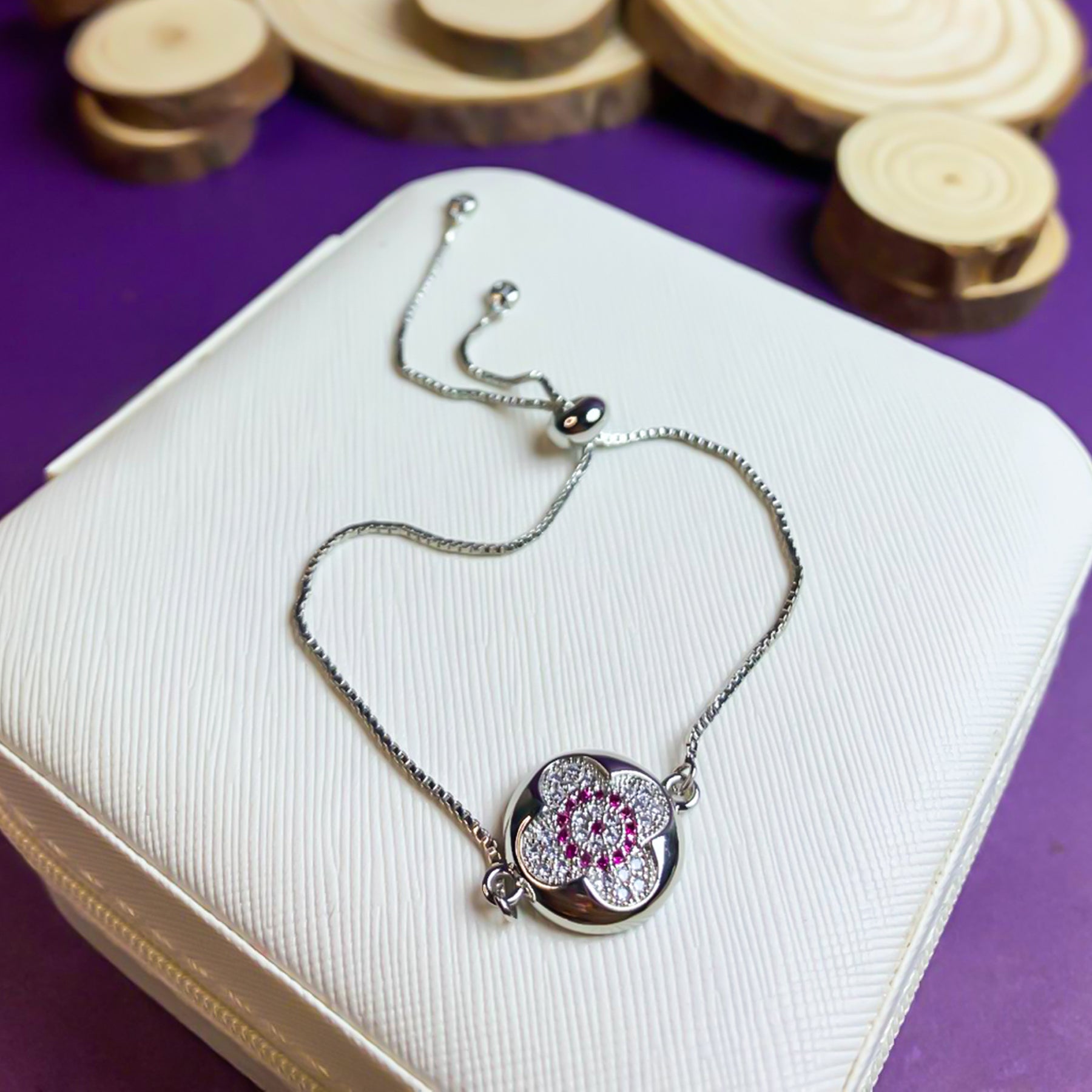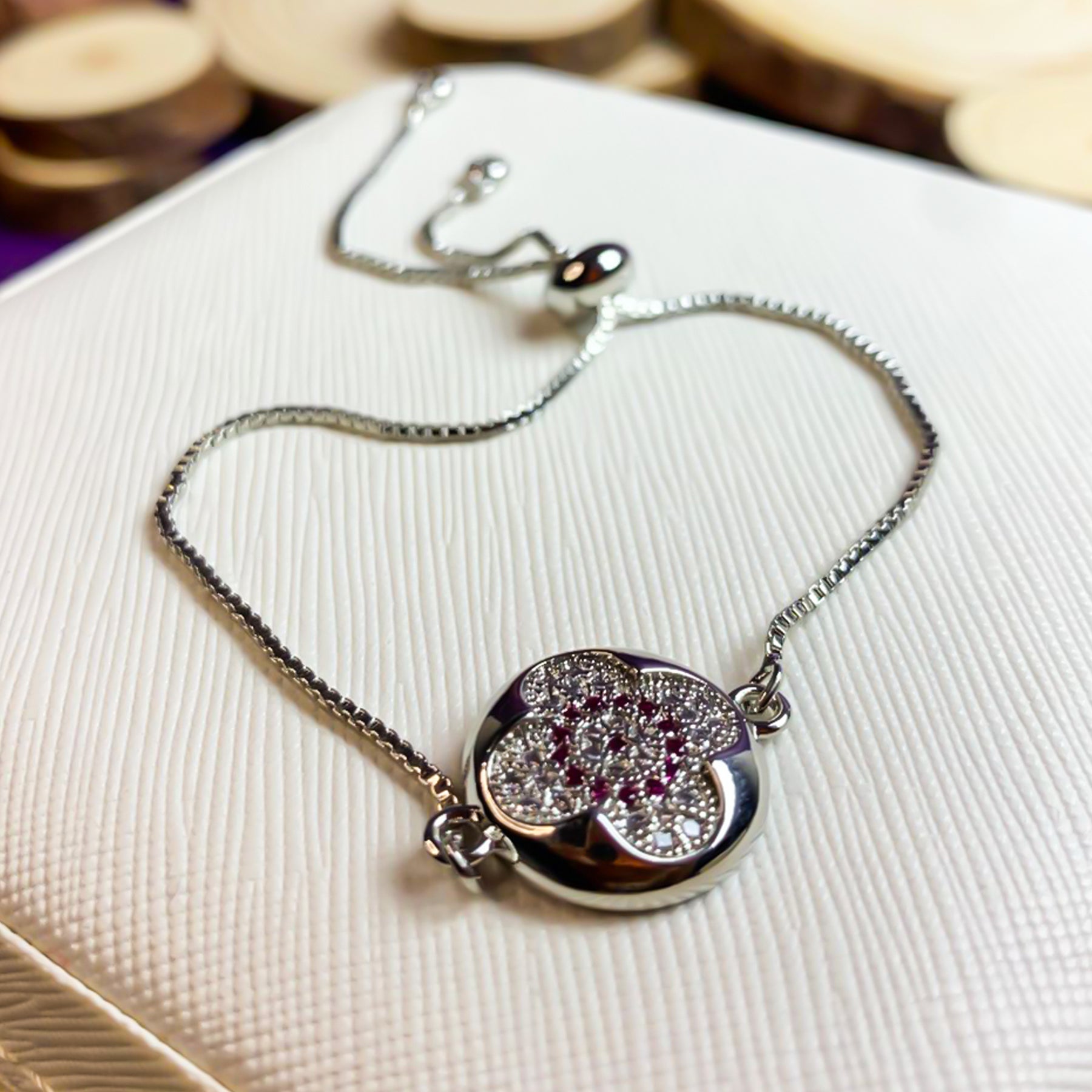 A beautiful silver-toned slider bracelet featuring a sparkling clover charm with a center of fiery red zircons, surrounded by brilliant clear crystals.