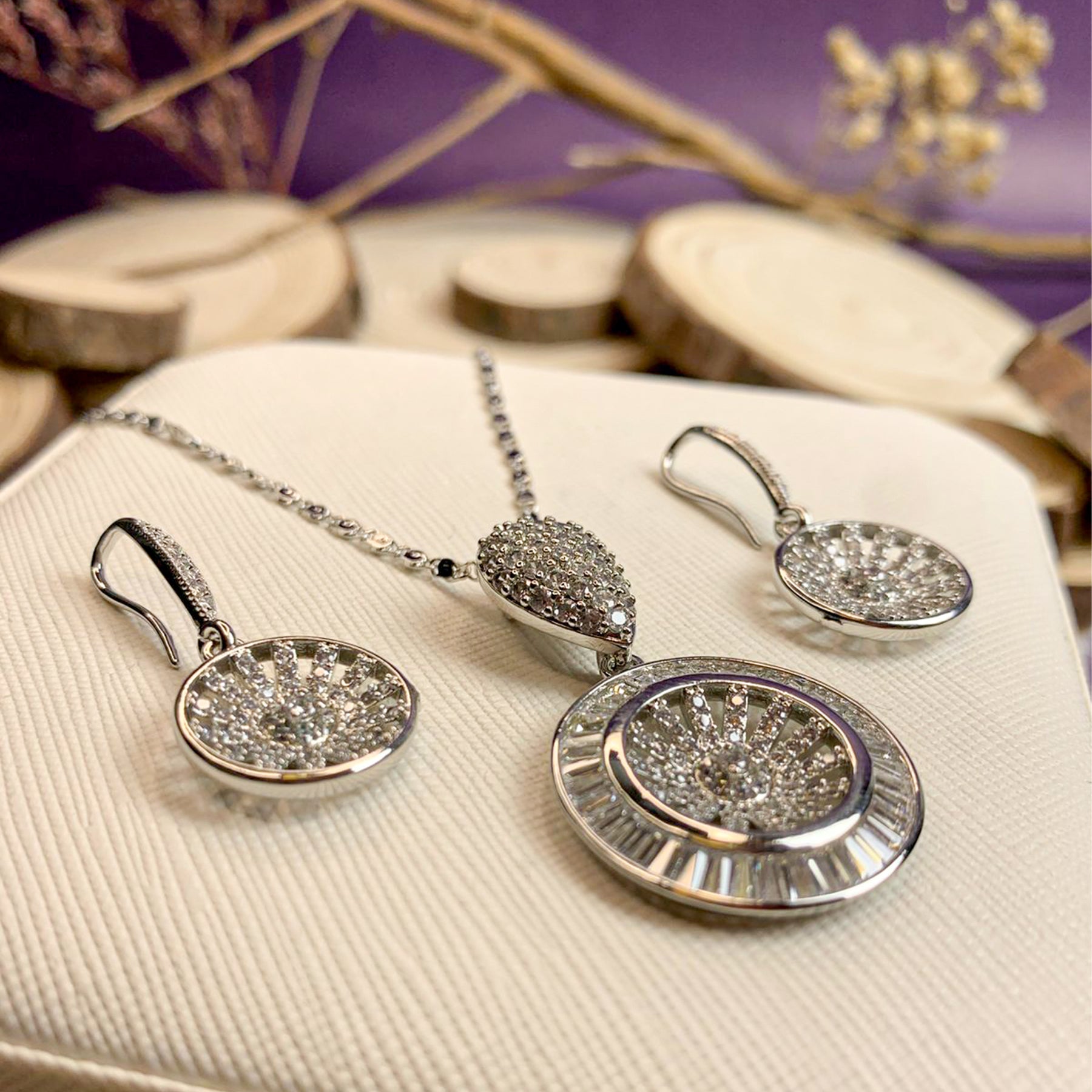 A dazzling silver-toned jewelry set featuring a circular pendant and matching drop earrings with a brilliant sunburst-style pave setting, framed by baguette-cut zircons.