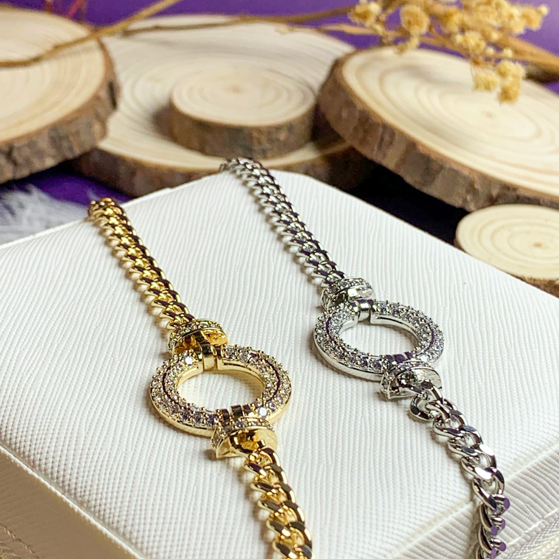 A modern bracelet featuring a stunning pave-encrusted circle link, available in both golden and silver tones, connected by a classic curb chain.